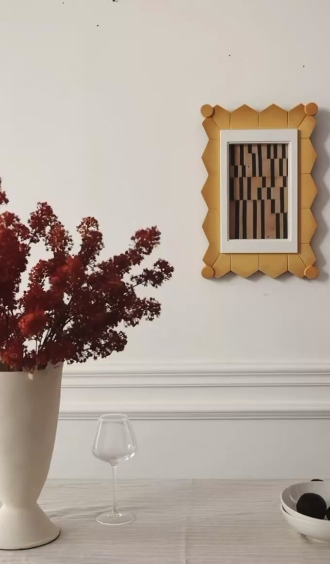 A sculptural statement frame crafted with a hand-finished gold-toned border and a striking geometric silhouette. The layered, faceted edges add depth and architectural interest, while the warm metallic finish brings a refined, gallery-like presence to your wall. Perfect for showcasing art prints, textures, or minimal compositions, this frame elevates any space with understated luxury and modern character.